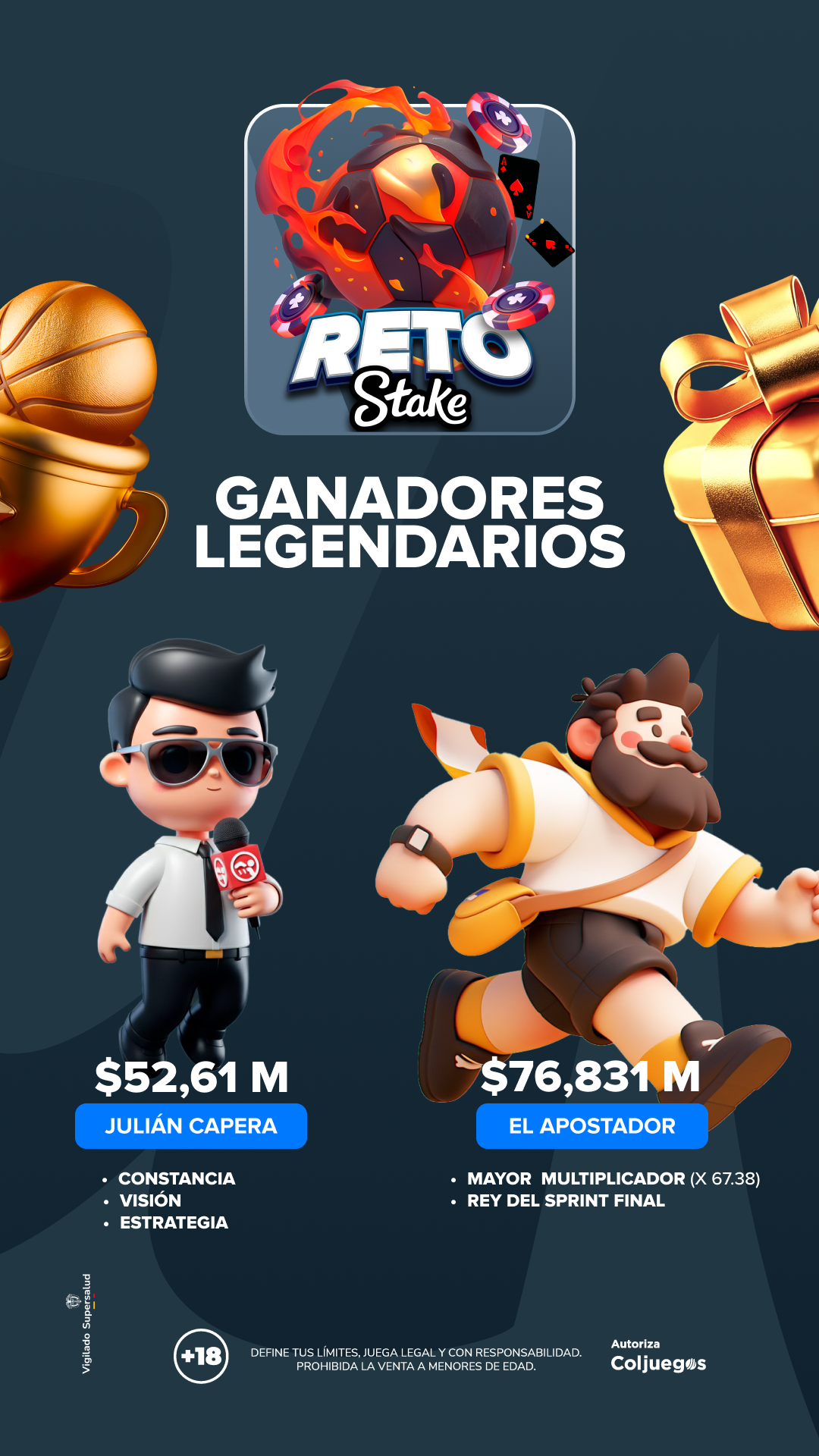 El objetivo del reto es que cada especialista acumule la mayor cantidad de créditos durante el período de vigencia de la promoción a partir de $10.000.000 en créditos de participación que serán usados sólo para fines del RETO. Al finalizar, el especialista con la mayor acumulación de créditos será el ganador. Ganará una Experiencia VIP STAKE al GP de México 2025 de F1. Además entre los usuarios que utilicen los códigos exclusivos de cada especialista se sortearán premios. El sorteo del premio de COP $10.000.000, para usuarios de la plataforma se realizará el día 17 de junio de 2025.